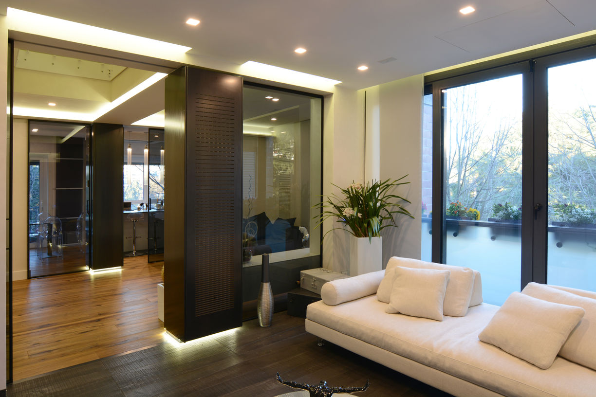 Particular care was dedicated to the audio/video systems and lighting fixtures: floor spotlights, LED steplight strips next to pendant lamps and wall sconces create a sober atmosphere and enveloping.